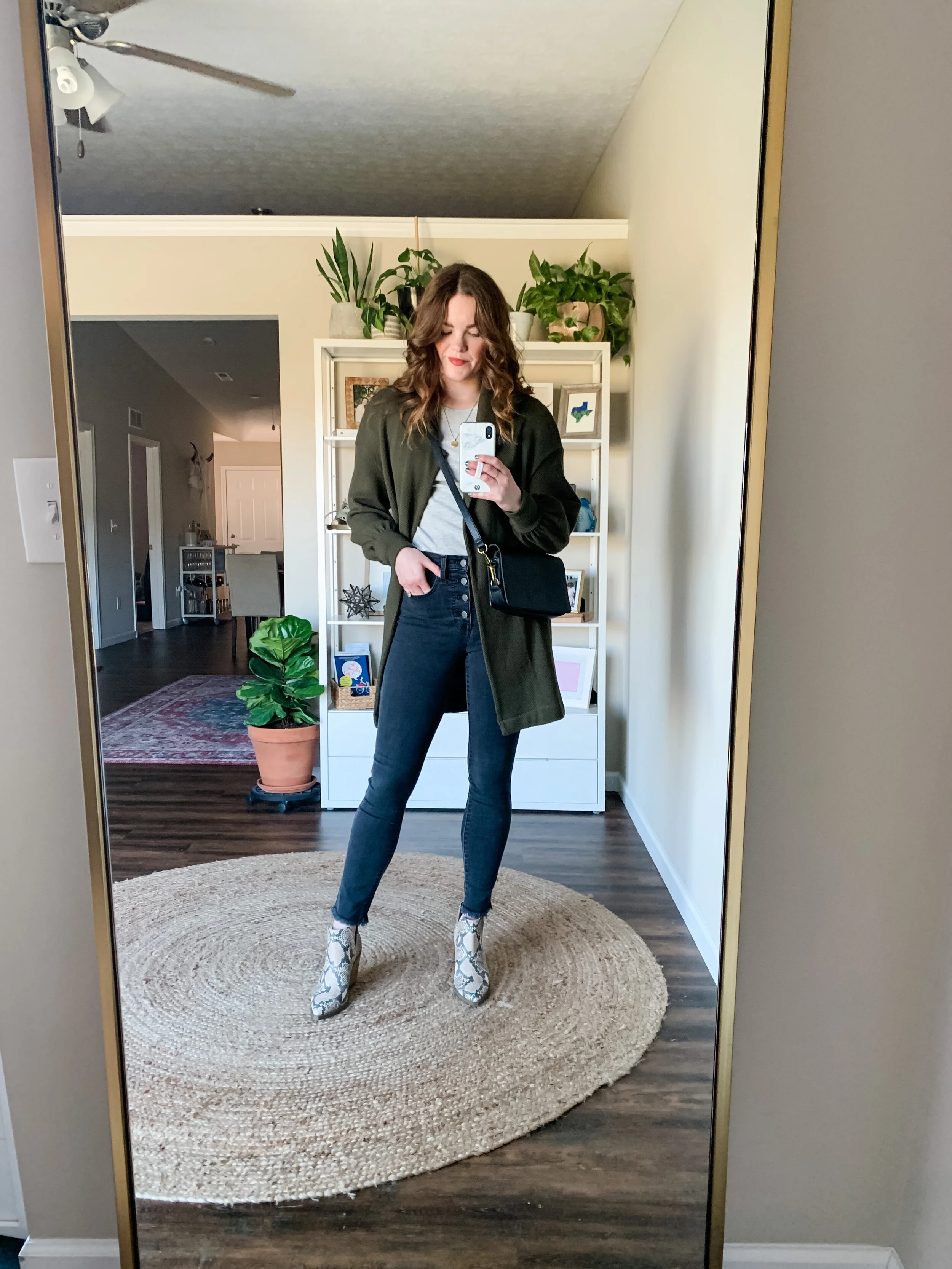 I love my faux leather leggings, but unlike most of the world, I am less concerned about covering my butt and more concerned about covering my crotch. So I loved adding this long cardigan over this turtleneck for added warmth and to cover up. I added the leopard booties for some interest.