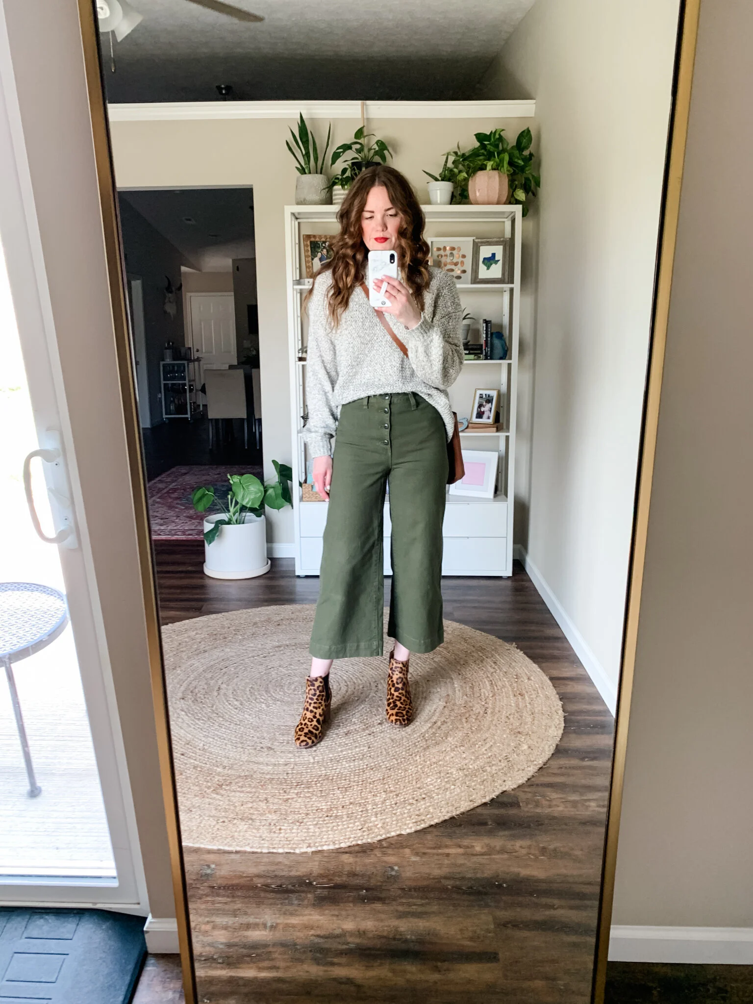 Now that we are back with a dark green school, I am finding more and more reason to wear these pants. I found a similar pair as mine are a couple of years old. I front tucked my sweater and added leopard booties for some fun!