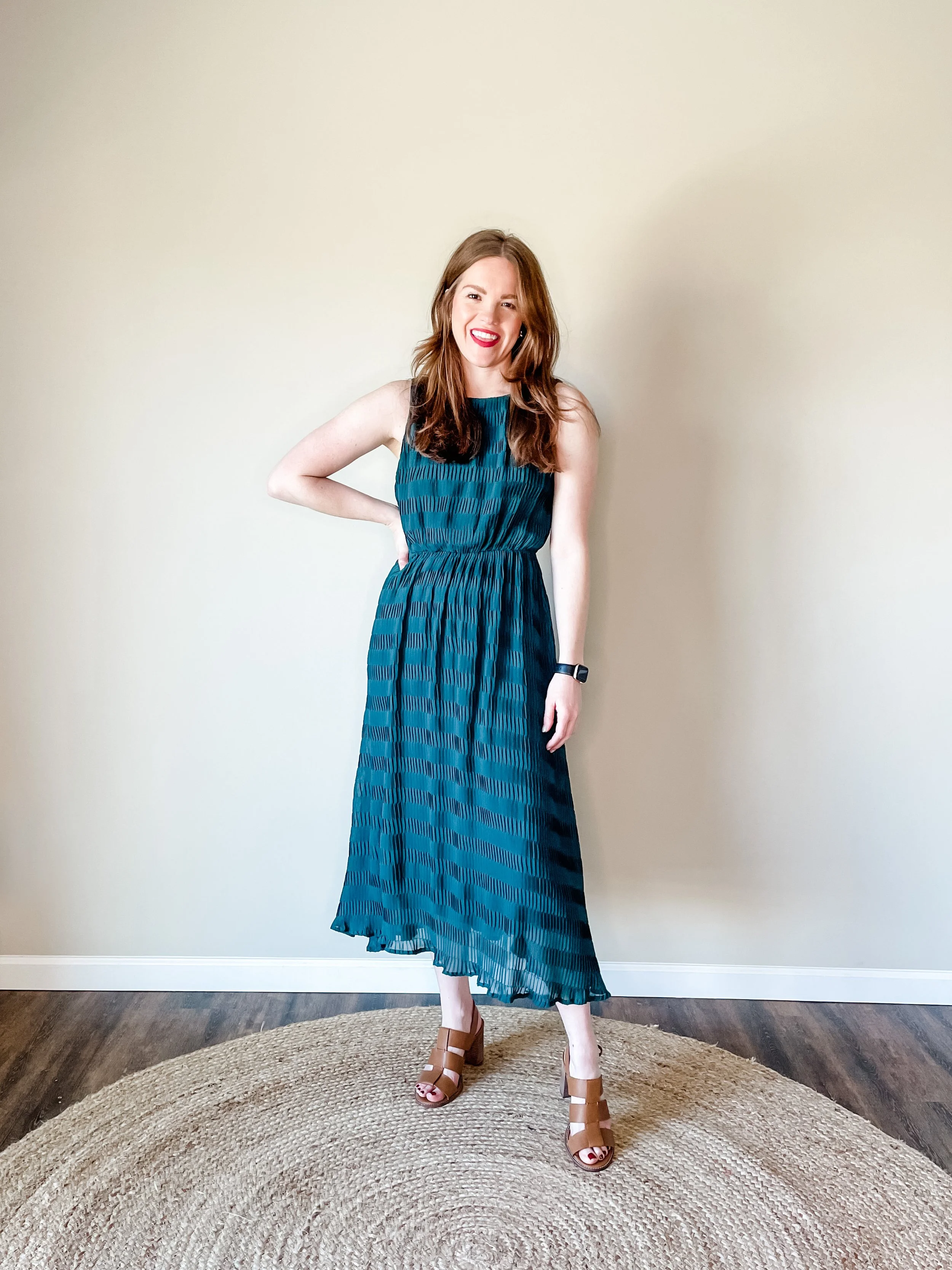 This teal Anthropologie dress was purchased for a wedding in 2017, and I have worn it to several weddings, events, and photos since. You can see photos of where I wore it for photos we took in North Carolina last April. I love the coloring of this dress for myself. And the texture is so fun and adds interest to a solid color dress.