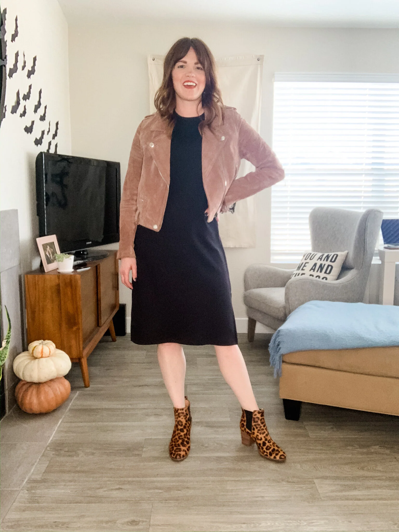 Lastly, I grabbed my favorite suede moto jacket and leopard booties. These two pieces are go-to’s for me in the fall as they dress up any look with little effort.