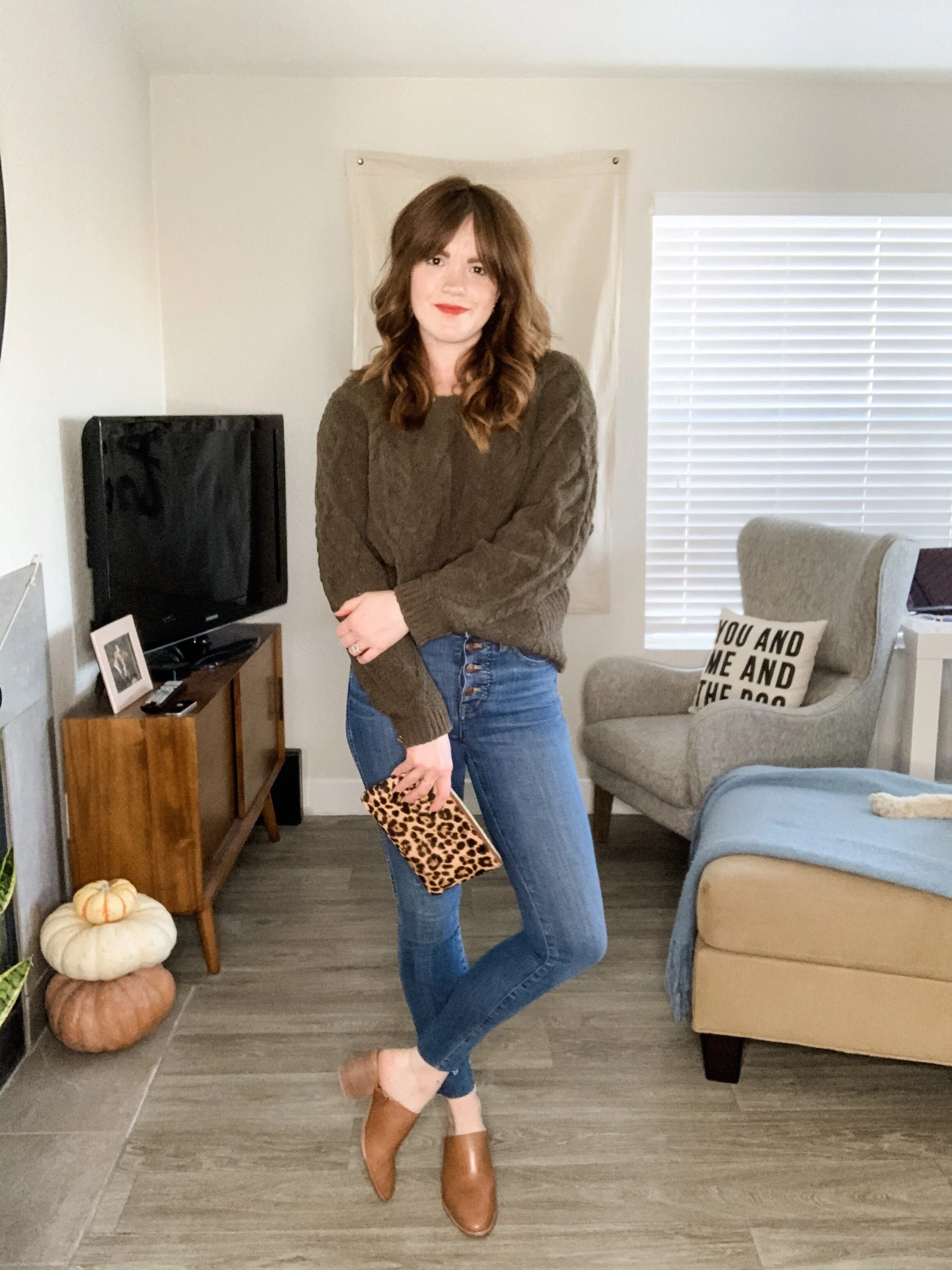 When I first set out to plan for this style session, I knew this sweater would be included. It is the perfect shade of green for the fall and holidays and it is so comfy. I wore it for mine and Brian’s first Christmas card we sent as a married couple. It is a couple of years old, but I linked a similar option. Since the sweater is oversized, I paired it with dark skinny jeans and since it’s not too cold in Vegas and we don’t wear shoes in the house I grabbed my brown mules. I finished the look with my leopard clutch.