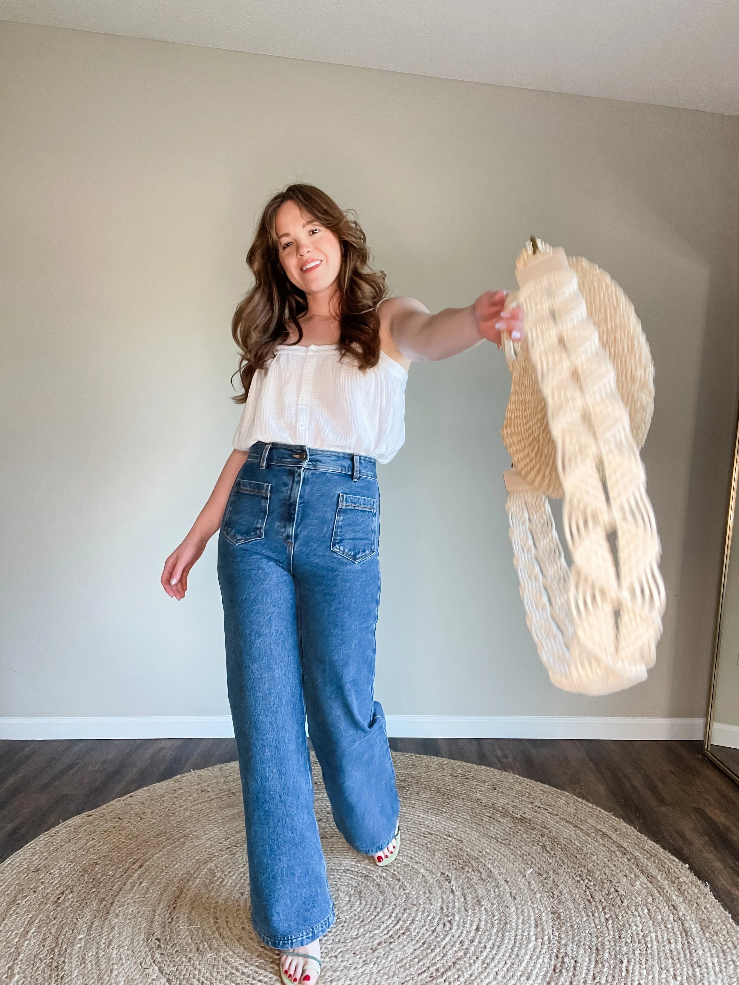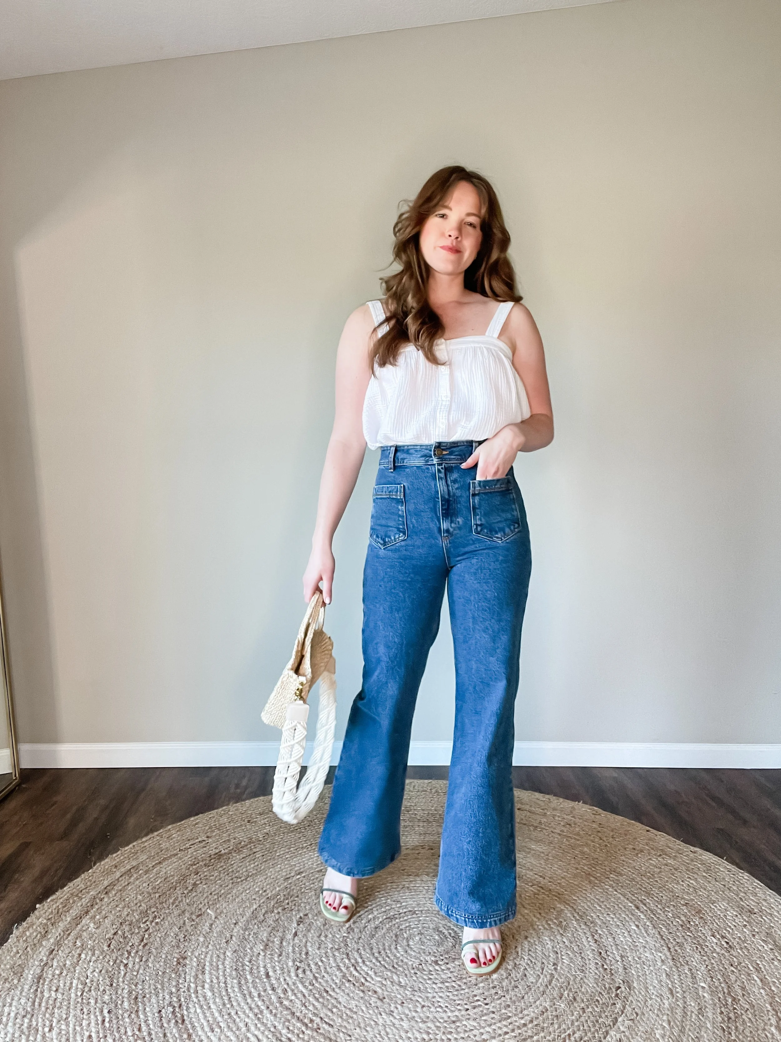 This looks feels so ‘70s to me. I love the strappy sandals, the flowy top tucked into the high-waisted pants, and the macrame bag strap. And it still feels like something I would wear. It leans toward the ‘70s without feeling costume-y.