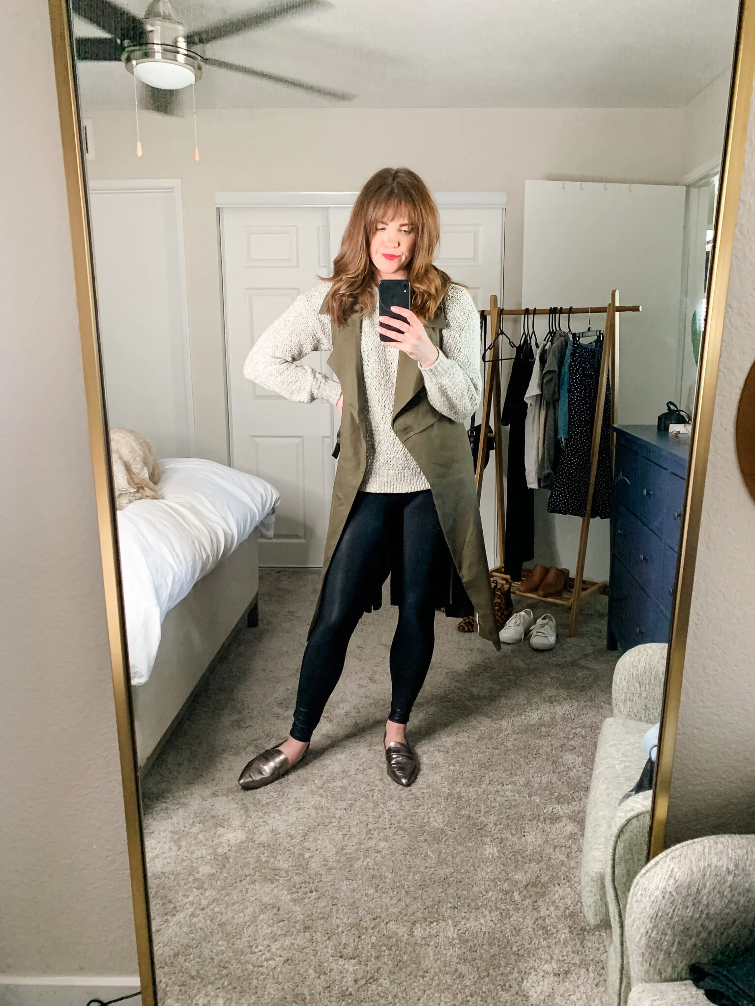 With the weather changing it was definitely on my list to incorporate my faux leather leggings. It’s been a while since I’ve worn these, but I am excited to have them back in the rotation. This sweater is my new favorite grey sweater and it’s currently on sale! I sized down one in the sweater because it is so oversized.