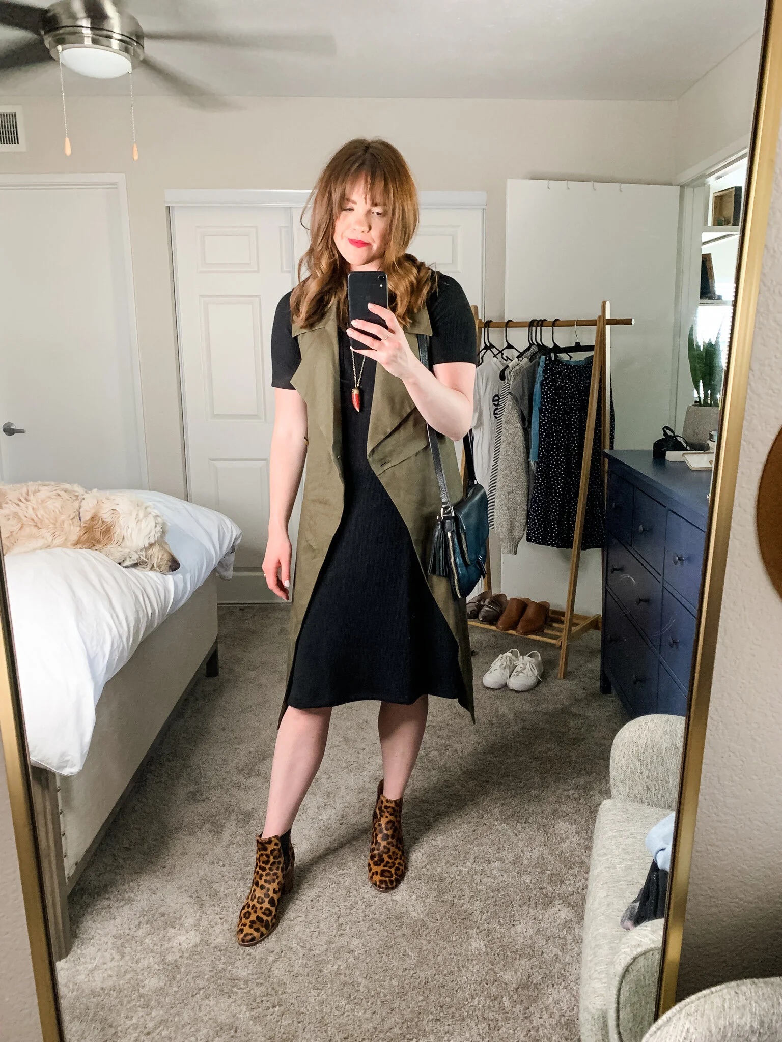 I recently added this dress to my wardrobe as I saw there was a hole for a black midi dress in my wardrobe. I wore it with white tennis shoes and a denim jacket this past weekend and got several compliments. The long vest brought this look to office chic and the leopard shoes keep it fun!